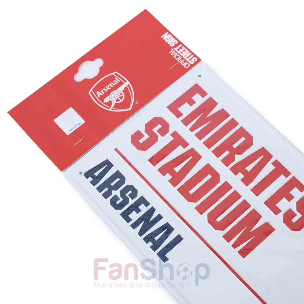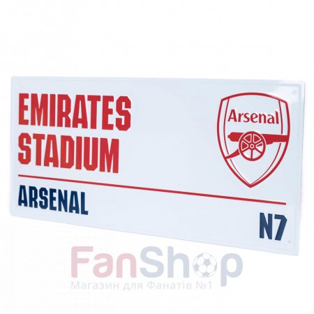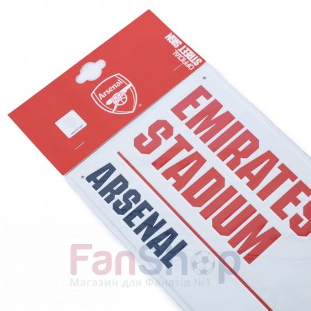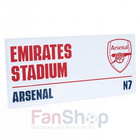 Металлическая табличка с эмблемой футбольного клуба Арсенал и реквизитами клубного стадиона Emirates Stadium