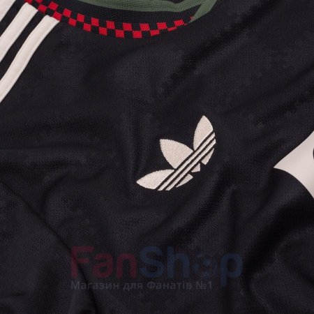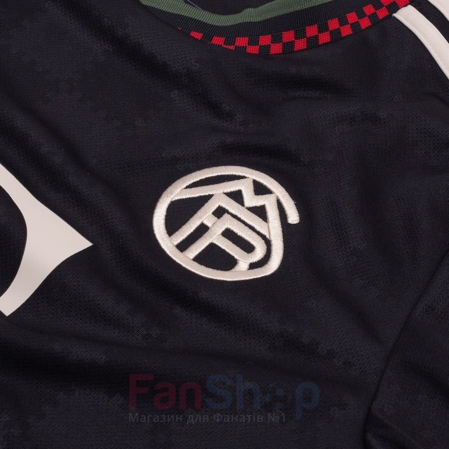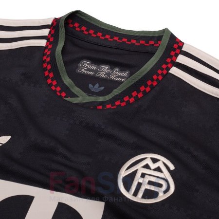 На груди нашивка ретро-эмблемы клуба и логотипа трилистник adidas, логотипы спонсоров и аббревиатура клуба на спине выполнены термопринтом