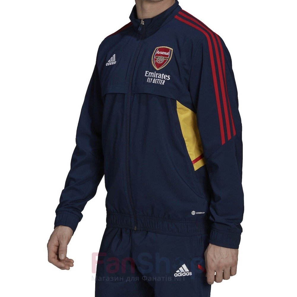 Оригинальная ветровка-олимпийка adidas с символикой футбольного клуба Арсенал Модель классического кроя с воротником-стойка, застегивается на полной молнии Три контрастные полоски adidas вдоль рукавов, сетчатая подкладка Боковые карманы на молнии; эластичные манжеты на рукавах и пояснице Эмблема клуба и логотип производителя вышиты Материал: 100% переработанный полиэстер Страна производитель: Вьетнам
