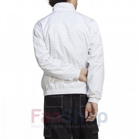 Оригинальная двухсторонняя ветровка adidas с символикой футбольного клуба Реал Мадрид Модель классического кроя с воротником-стойка, застегивается на полной молнии Боковые карманы на молнии; эластичные манжеты на рукавах и пояснице Эмблема клуба и логотип производителя вышиты Материал: 100% переработанный полиэстер