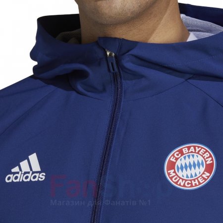 Оригинальная ветровка adidas с символикой футбольного клуба Бавария Модель преталенного кроя с высоким воротником-стойка и капюшоном, застегивается на полной молнии Боковые карманы; эластичные манжеты на рукавах Эмблема клуба и логотип производителя нанесены термопринтом Материал: 100% переработанный полиэстер