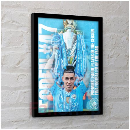Картина в деревянной черной рамке с изображением футболиста Фила Фодена ФК Манчестер Сити