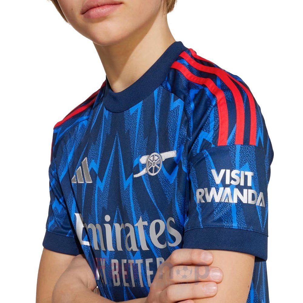 На груди нашивка логотипа клуба, логотипа adidas и принт логотипа титульного спонсора Fly Emirates