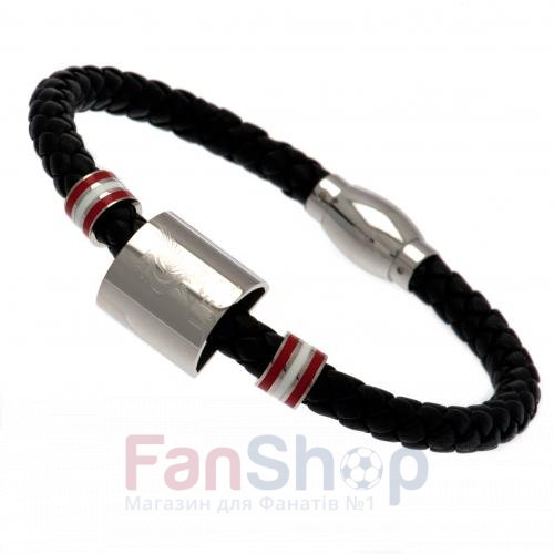 Оригинальный кожаный плетенный браслет с двумя кольцами клубных цветов и стальной плашкой с выгравированной эмблемой ФК Ливерпуль