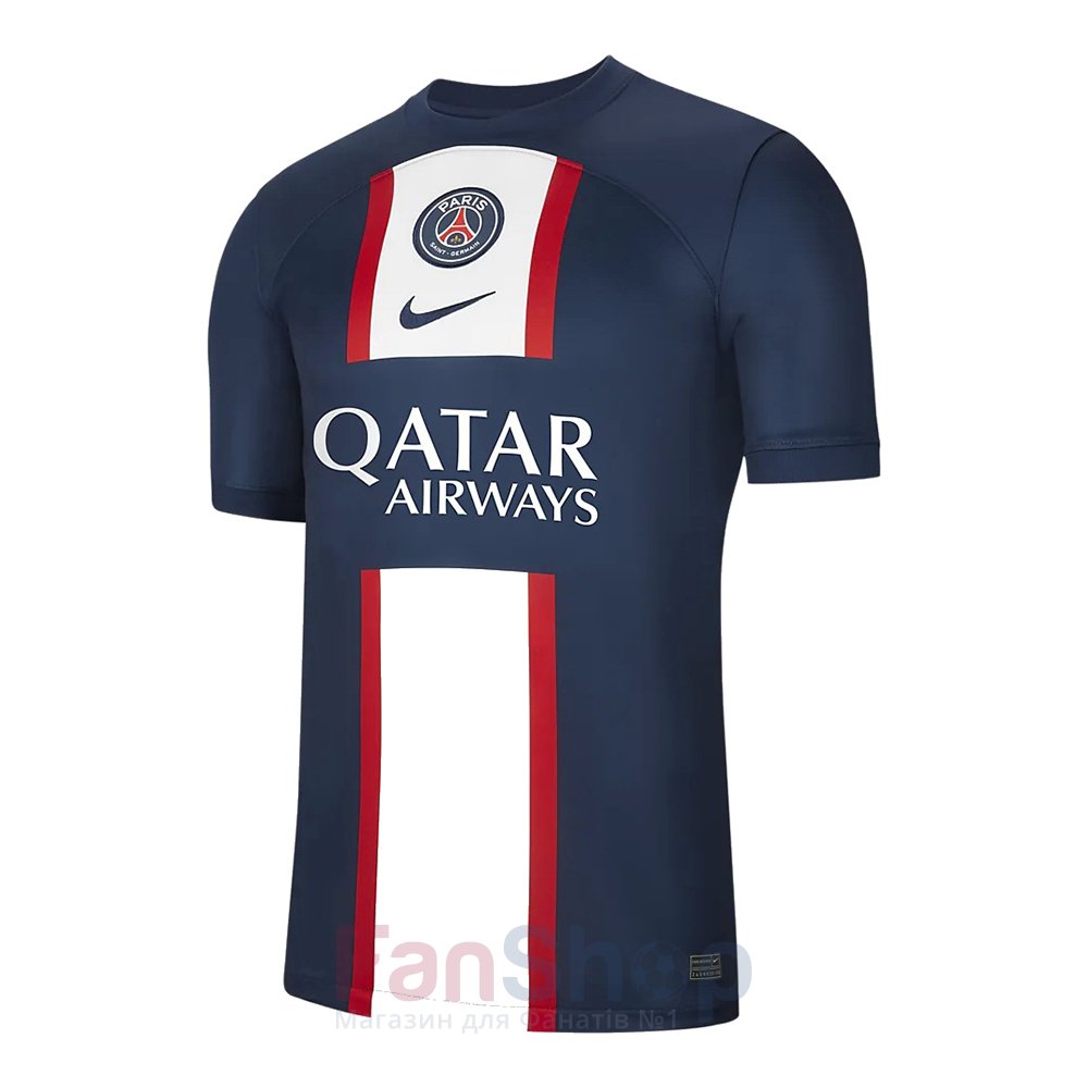 Оригінальна ігрова футболка основного комплекту розроблена компанією Nike на сезон 2022-23. Виконана у традиційному темно-синьому кольорі з біло-червоними вставками посередині На грудях нашивка емблеми клубу та логотип виробника, логотипи спонсорів нанесені білим термпринтом Круглий еластичний комір з написом Paris позаду Виготовлена з тканини Nike Breathe використовуючи новий текстурний візерунок ниток, що відводить вологу та забезпечує комфорт Матеріал: 100% поліестер/Dri-Fit technology
