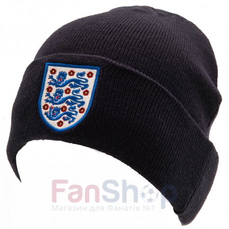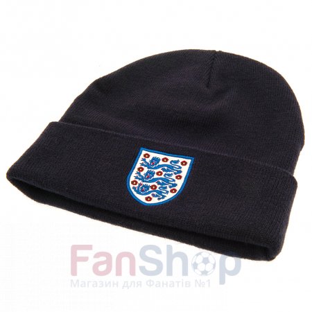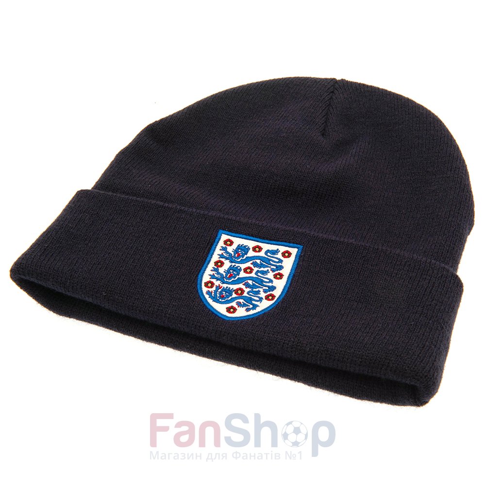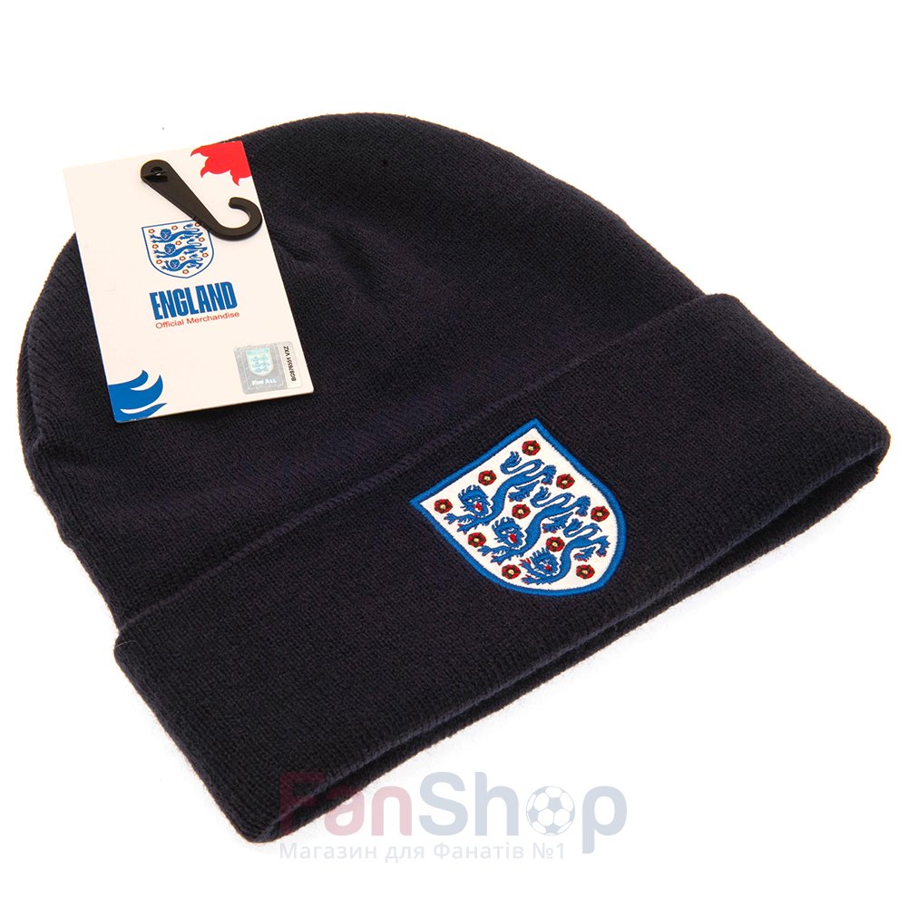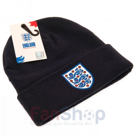 Оригінальна трикотажна шапочка темно-синього кольору з вишитою емблемою збірної Англії на підвороті