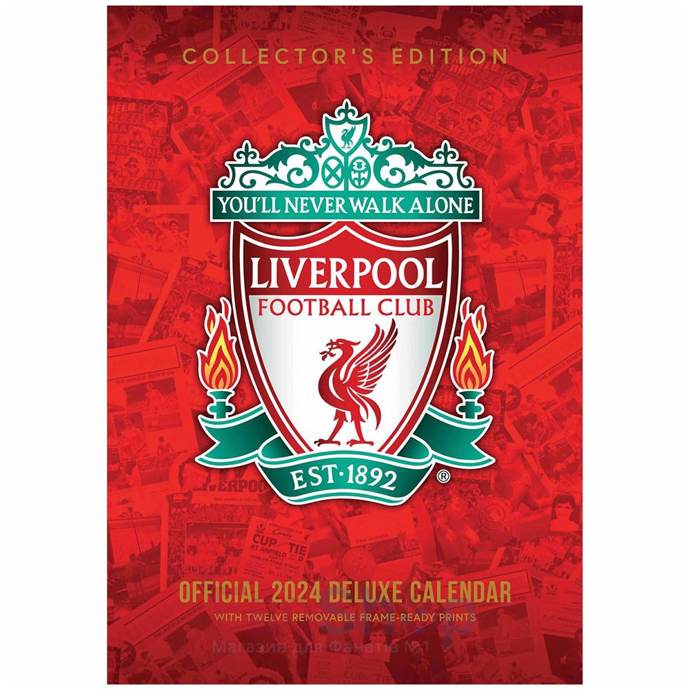 Оригінальний настінний перекидний календар на 2026 рік серії Deluxe з зображенням гравців і символіки ФК Ліверпуль на кожній сторінці Складається з 12-ти листів-ілюстрацій формату А3 з перфорацією з боків для легкого відділення і розміщення під рамку як окремі постери Листи скріплені металевою спіраллю, зверху пластина для кріплення Розмір: А3 ~ 42cm x 30cm