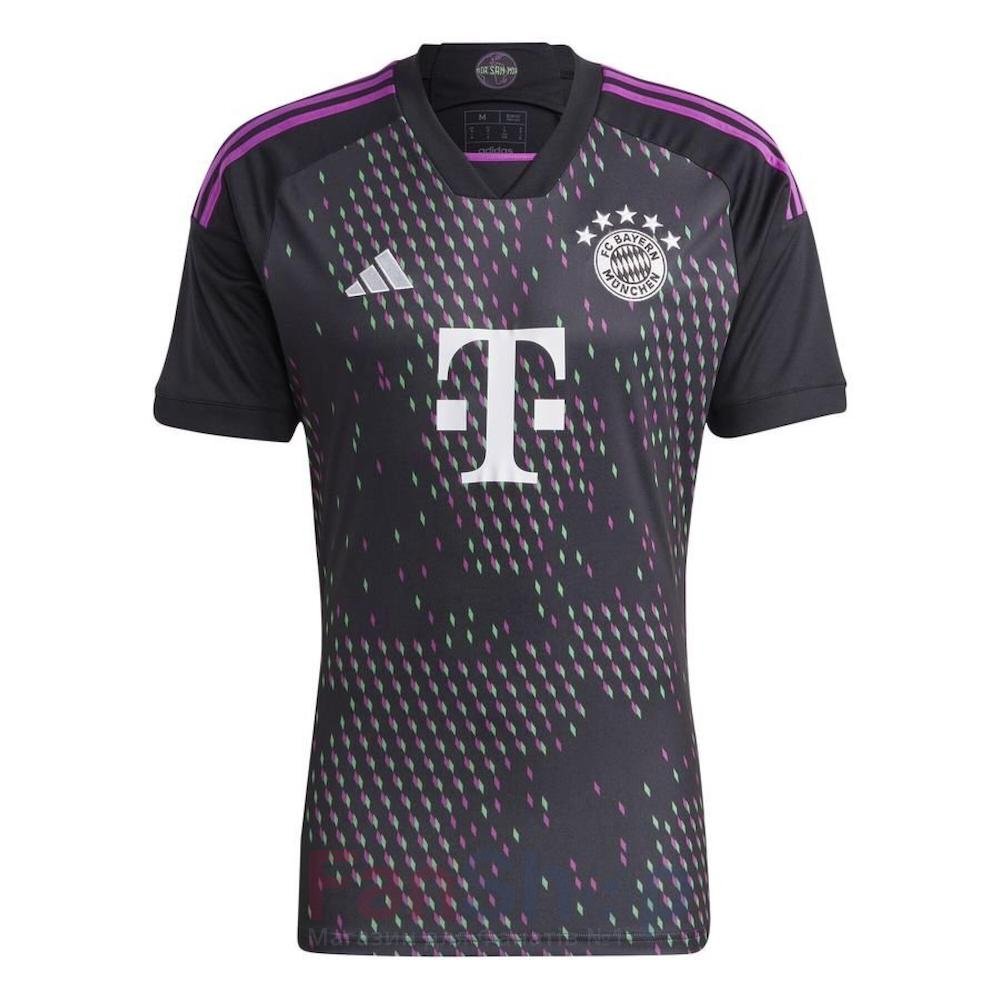 Оригінальна ігрова футболка виїзного комплекту форми ФК Баварія спроектована компанією adidas на сезон 2023-24 Виконана в чорному кольорі із зеленими та фіолетовими ромбоподібними вкрапленнями V-подібний еластичний комір, три фіолетові смужки на плечах, фіолетова окантовка на рукавах і вздовж футболки Над емблемою з'явилася ще одна зірка на честь перемоги у Лізі Чемпіонів у сезоні 2020-21 На грудях емблема клубу та логотип adidas - вишиті, логотипи спонсорів та назва клубу на спині виконані термопринтом фіолетового кольору Матеріал: сітчаста перфорована тканина, що відводить вологу, з технологією AEROREADY Вироблено на фабриці adidas зі 100% переробленого поліестеру з метою збереження ресурсів та зменшення шкідливих викидів в атмосферу