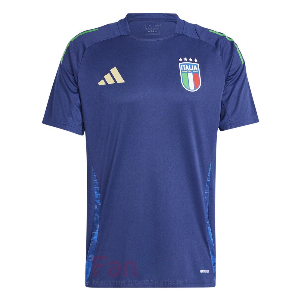 Оригінальна тренувальна футболка adidas виготовлена для тренувань гравців збірної Італії Модель приталеного крою з округлим коміром, термопринт емблеми збірної та логотипу виробника на грудях Матеріал: що відводить вологу сітчаста перфорована тканина з технологією AEROREADY Вироблено на фабриці adidas в Камбоджі з 100% переробленого поліестеру з метою збереження ресурсів і зменшення шкідливих викидів в атмосферу