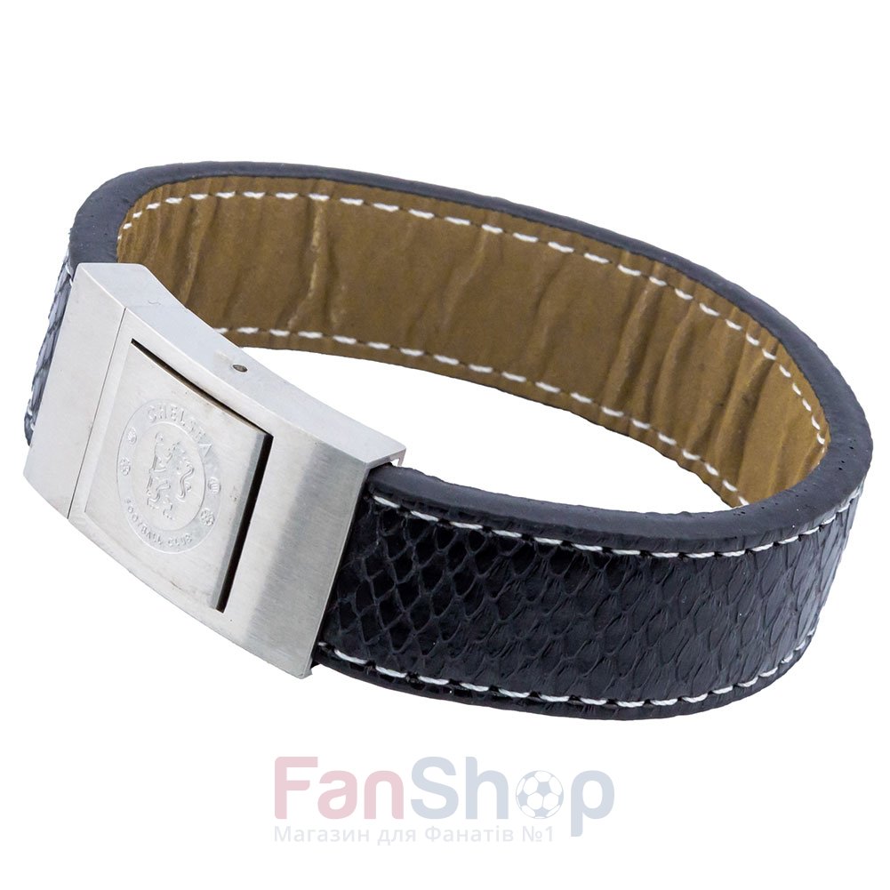 Чорний браслет з натуральної шкіри з ніжним крокодиловим принтом колекції ФК Челсі Прямокутна застібка із нержавіючої сталі з вигравіруваною емблемою клубу Розміри: 21.5cm x 1.5cm У подарунковій упаковці
