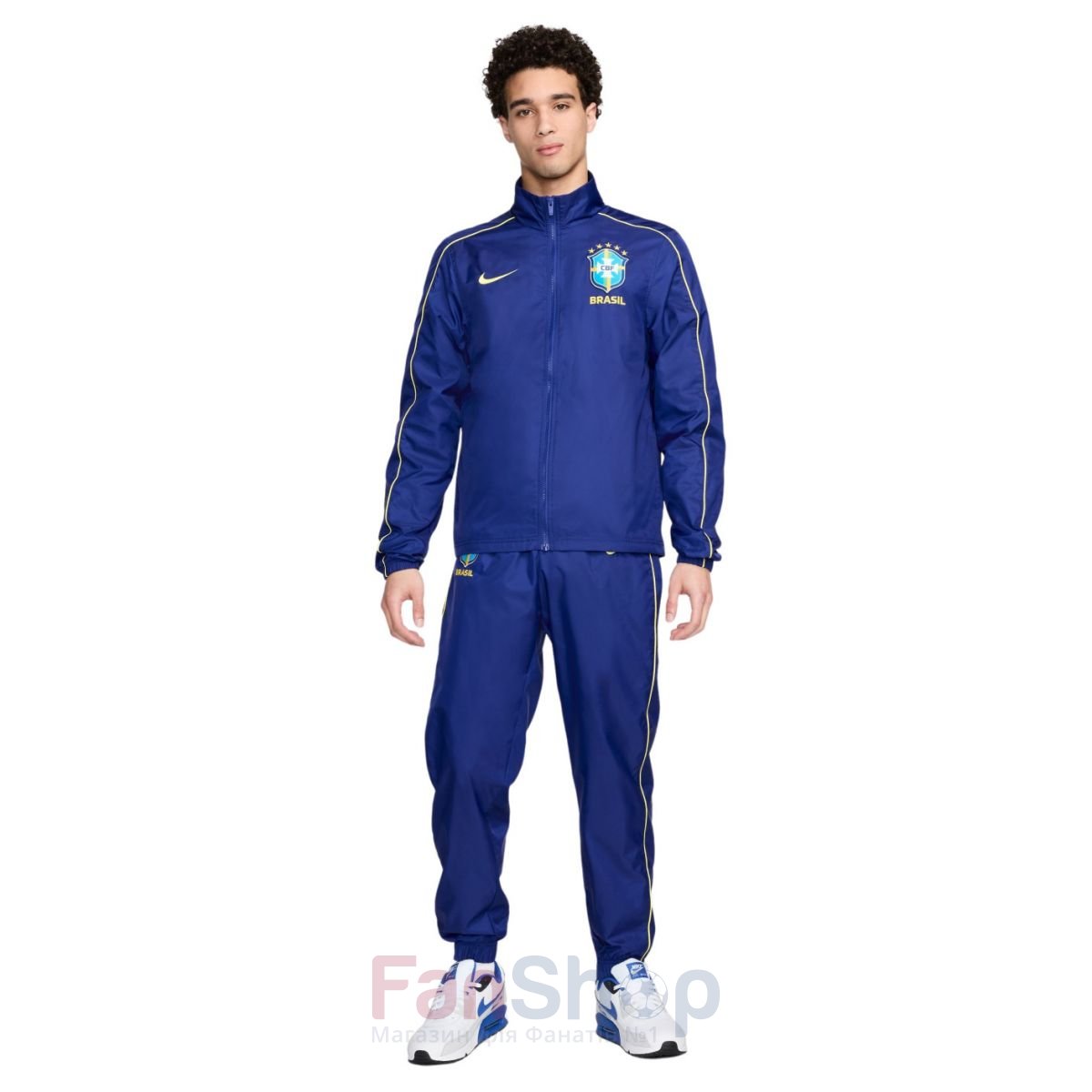 Оригінальний спортивний костюм nike колекції футбольної збірної Бразилії Олімпійка з коміром стійкою застібається на повній блискавці Вільний крій олімпійки забезпечує відмінну посадку, плоскі шви та еластичні манжети запобігають натиранню Штани злегка звуженої форми з еластичними манжетами знизу, еластичний пояс з шнурком, що регулює, бічні кишені на блискавці Емблема збірної та логотип виробника нанесені термопринтом Костюм ідеально підходить як для тренувань, так і для повсякденного використання Виготовлено з легкого високотехнологічного матеріалу за технологією Nike DRI-FIT