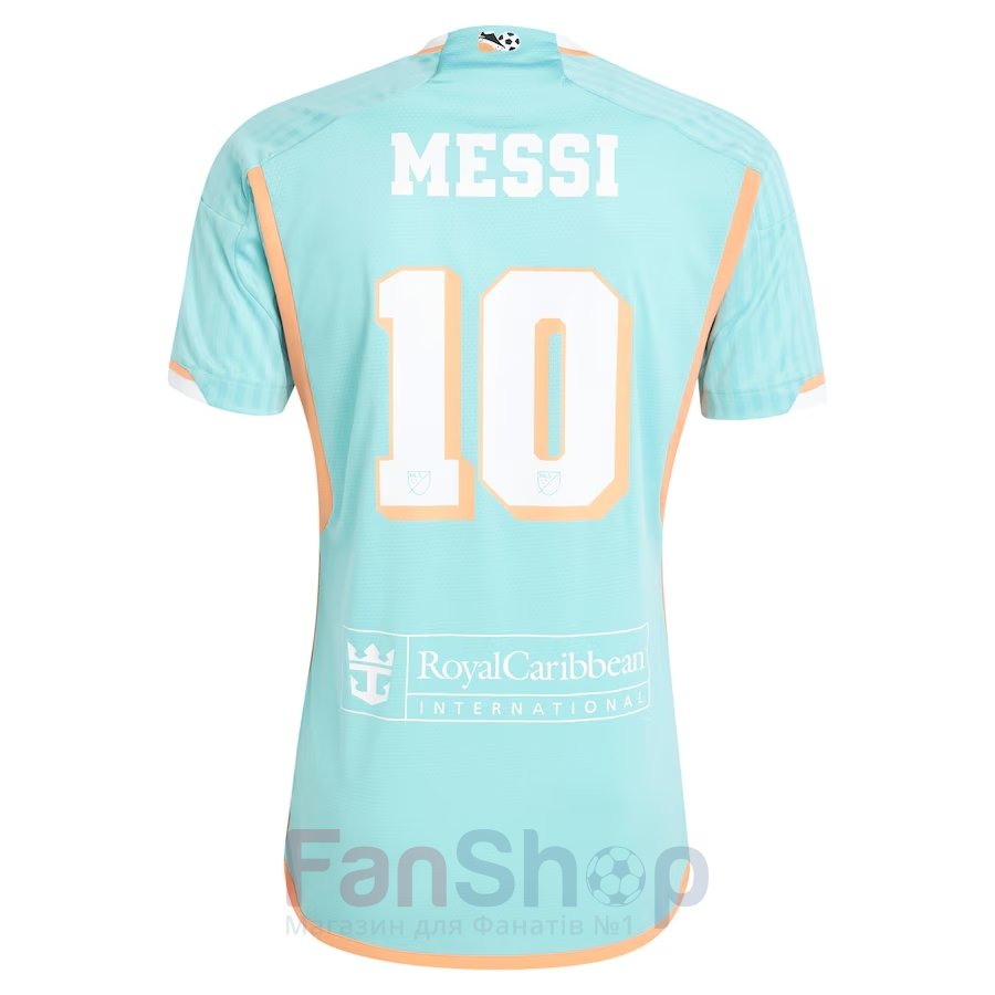 Оригінальна ігрова футболка третього комплекту форми ФК Інтер Маямі сезону 2024-25 з нанесенням Messi 10 Виконана в мятному кольорі з білими та помаранчевими вставками на честь культового Оранжевого Боула(Orange Bowl) Округлий білий еластичний комір, три білі смужки на плечах та вставки з боків На грудях нашивка емблеми та назви клубу, логотипу adidas, ззаду принт логотипу спонсора Матеріал: сітчаста перфорована тканина, що відводить вологу, з технологією AEROREADY Вироблено на фабриці adidas зі 100% переробленого поліестеру з метою збереження ресурсів та зменшення шкідливих викидів в атмосферу