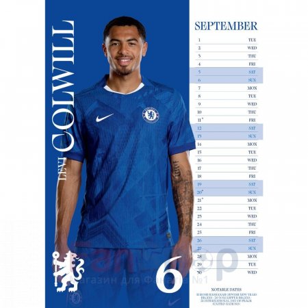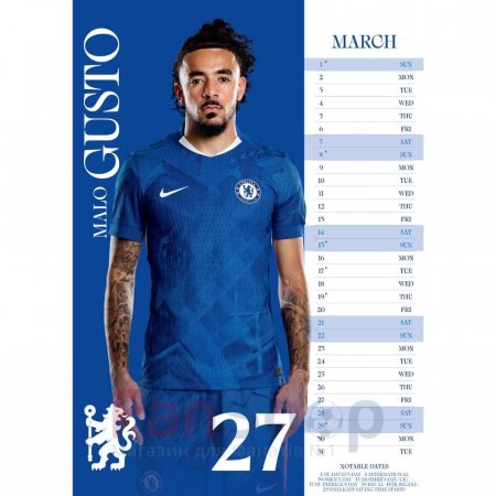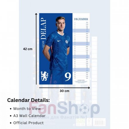 Настінний перекидний календар на 2026 рік з зображенням гравців ФК Челсі на кожній сторінці