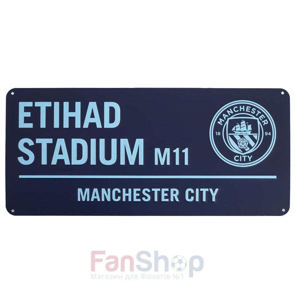 Вулична металева табличка пофарбована в клубний синій колір з назвою клубного стадіону ФК Манчестер Сіті